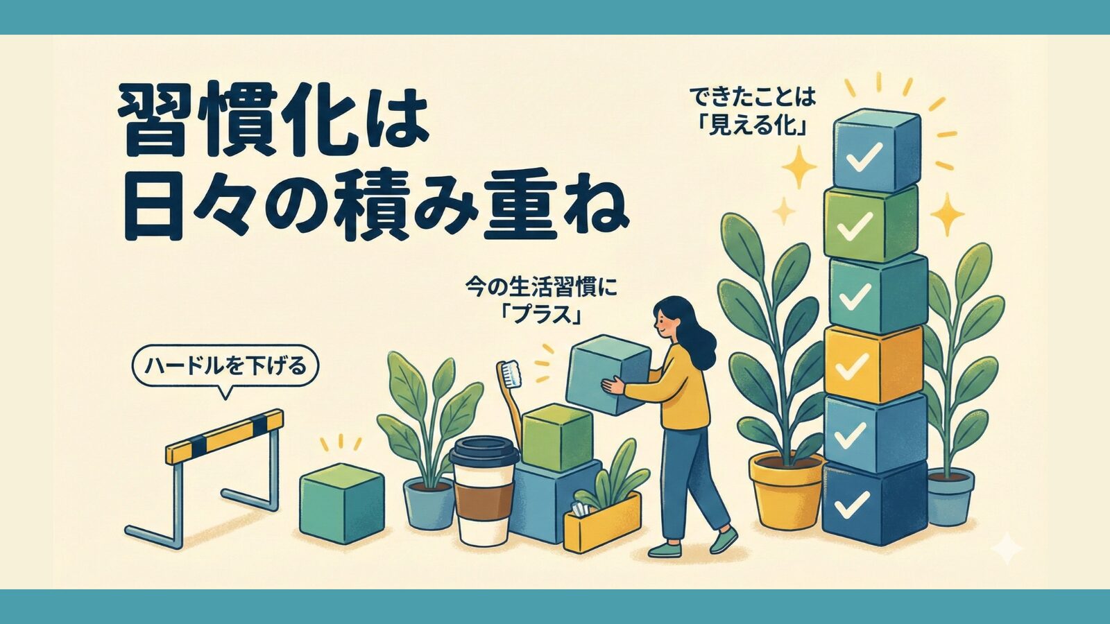 ここでは「習慣化のハードルを下げる」「今の生活習慣にプラスしていく」「見える化する」の3点に絞って解説していきます。
